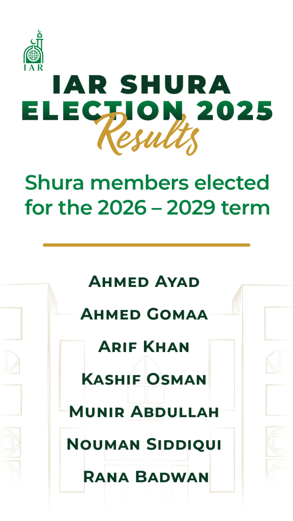 Dear IAR community, On behalf of the Islamic Association of Raleigh, please join me in congratulating the newly elected members of the Shura (listed alphabetically): We ask Allah to bless their efforts and grant them success as they prepare to begin their term on January 11th, 2026. I would also like to extend my heartfelt appreciation to all of the candidates who were not elected this cycle. Your willingness to volunteer, serve, and step forward for the sake of this community is truly admirable. May Allah reward your intentions and efforts, and may He continue to open doors for your